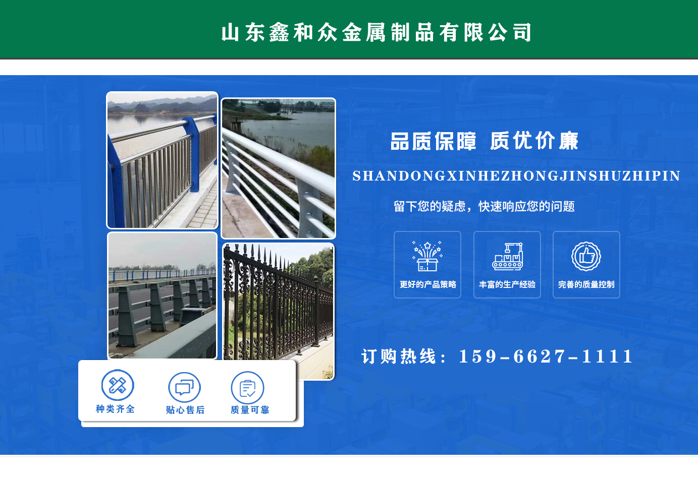 山東鑫和眾金屬制品有限公司主要產(chǎn)品有防撞護欄,橋梁護欄,道路護欄,河道護欄,不銹鋼護欄等護欄。提供設計方案,一站式定制,包您滿意價格優(yōu)惠,歡迎來電咨詢! 公司常年從事銷售護欄防撞護欄,橋梁護欄,道路護欄,河道護欄,不銹鋼護欄,橋梁鋼護欄,河道燈光護欄等。產(chǎn)品廣泛應用于橋梁、河道、旅游景區(qū)、道路、公路、公園、小區(qū)、景觀、道路防撞等領域。 公司產(chǎn)品均采用優(yōu)質(zhì)不銹鋼材料,符合相關(guān)標準。各種型號不銹鋼復合管及護欄,質(zhì)量嚴格把控。產(chǎn)品強度高、耐腐蝕、焊接牢固、抗沖擊、性能好,防撞護欄結(jié)構(gòu)簡單、美觀實用大方?! g迎前來訂購!...